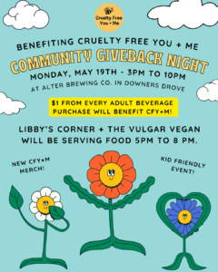 Our next Community Giveback Night at Alter Brewing Co. is Monday, May 19th! Between 3pm to 10pm, $1 from every adult beverage purchase will be donated to Cruelty Free You + Me. Cold beer and supporting a great cause? What could be better on a Monday night? Oh, that’s right…Libby’s Corner will be there serving hot food from 5-8pm, and The Vulgar Vegan will also be there with tasty cupcakes, cookies, and cinnamon rolls!