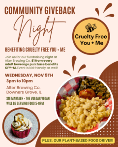 Join us at Alter Brewing Co. for our Community Giveback Night! $1 from every adult beverage purchase will benefit CFY+M. We will have activities for kiddos. Ste Marten will be serving hot food and The Vulgar Vegan will be serving up dessert! We are also hosting a Plant-Based Food Drive during this event. See details below:
